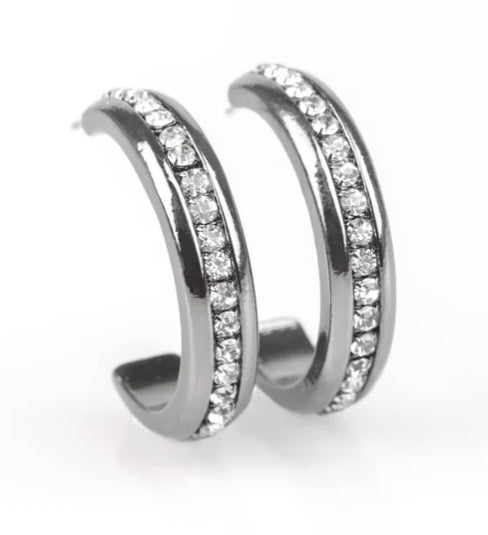 A row of glassy white rhinestones is encrusted down the spine of a shiny gold hoop for a refined look. Earring attaches to a standard post fitting. Hoop measures 1 1/4" in diameter.