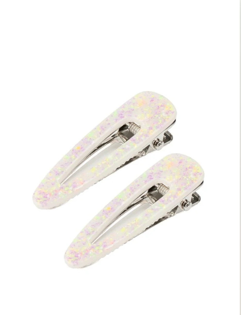Featuring an iridescent speckled pattern, a pair of colorful acrylic hair clips pull back the hair for a retro inspired look. Features standard hair clips. Sold as one pair of hair clips.