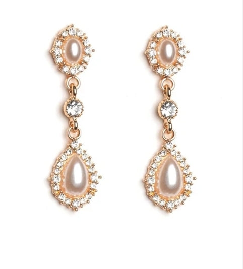 A solitaire white rhinestone is linked between two pearly and white rhinestone encrusted frames, creating an elegant lure. Earring attaches to a standard post fitting. Sold as one pair of post earrings.