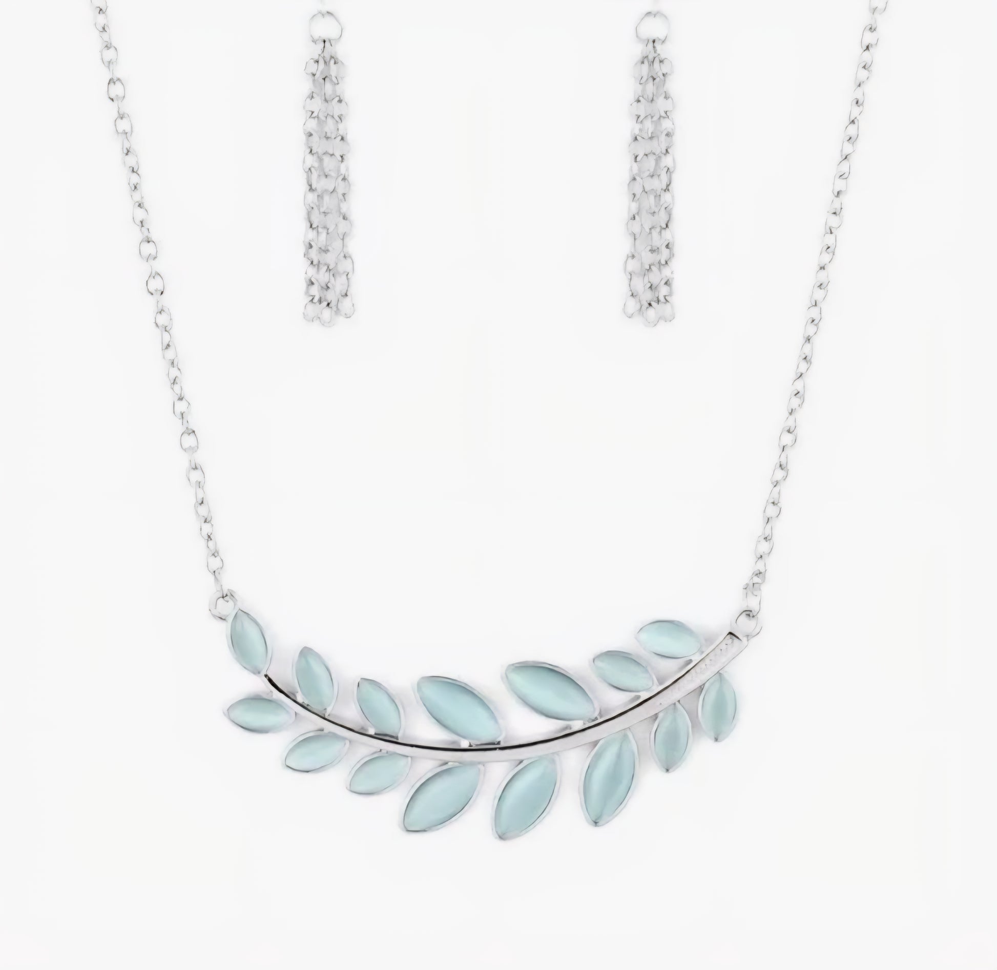 Dotted with tranquil green cat's eye stones, a leafy silver branch delicately curves below the collar for a whimsical look. Features an adjustable clasp closure.