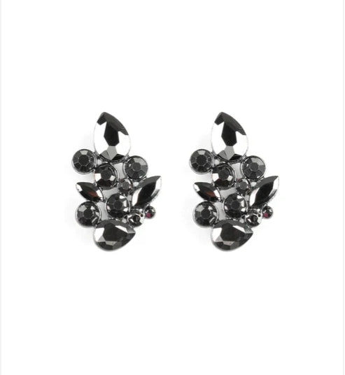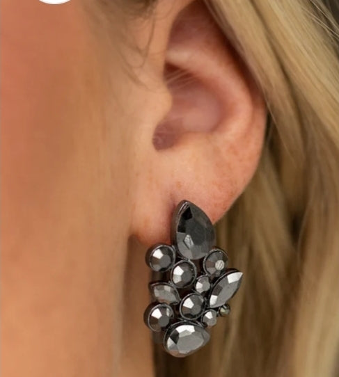 Featuring an array of round, teardrop, and marquise style cuts, a collision of hematite rhinestones explode into a blinding frame. Earring attaches to a standard post fitting.