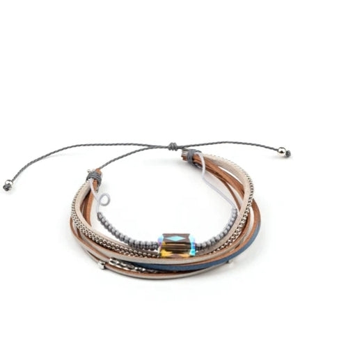 Infused with an iridescent gem-like centerpiece, a mashup of strands of silvery and blue leather layer across the wrist for a trendy look. Small metallic accents are sprinkled throughout the stack, adding a hint of sheen. Features an adjustable sliding knot closure.