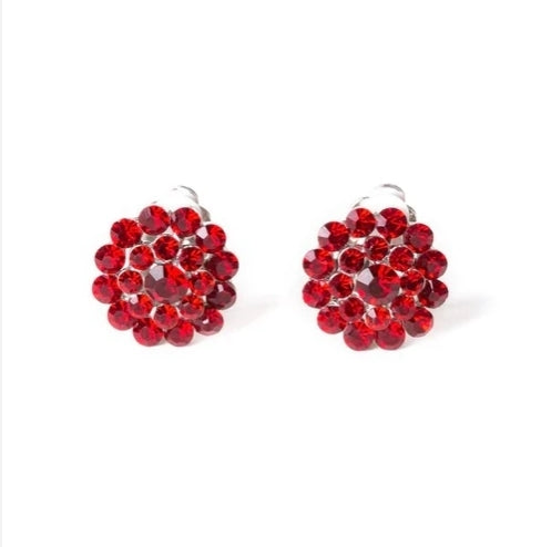 A collection of fiery red rhinestones stack into a glamorous floral frame for a sparkling look. Earring attaches to a standard clip-on fitting. Sold as one pair of clip-on earrings.