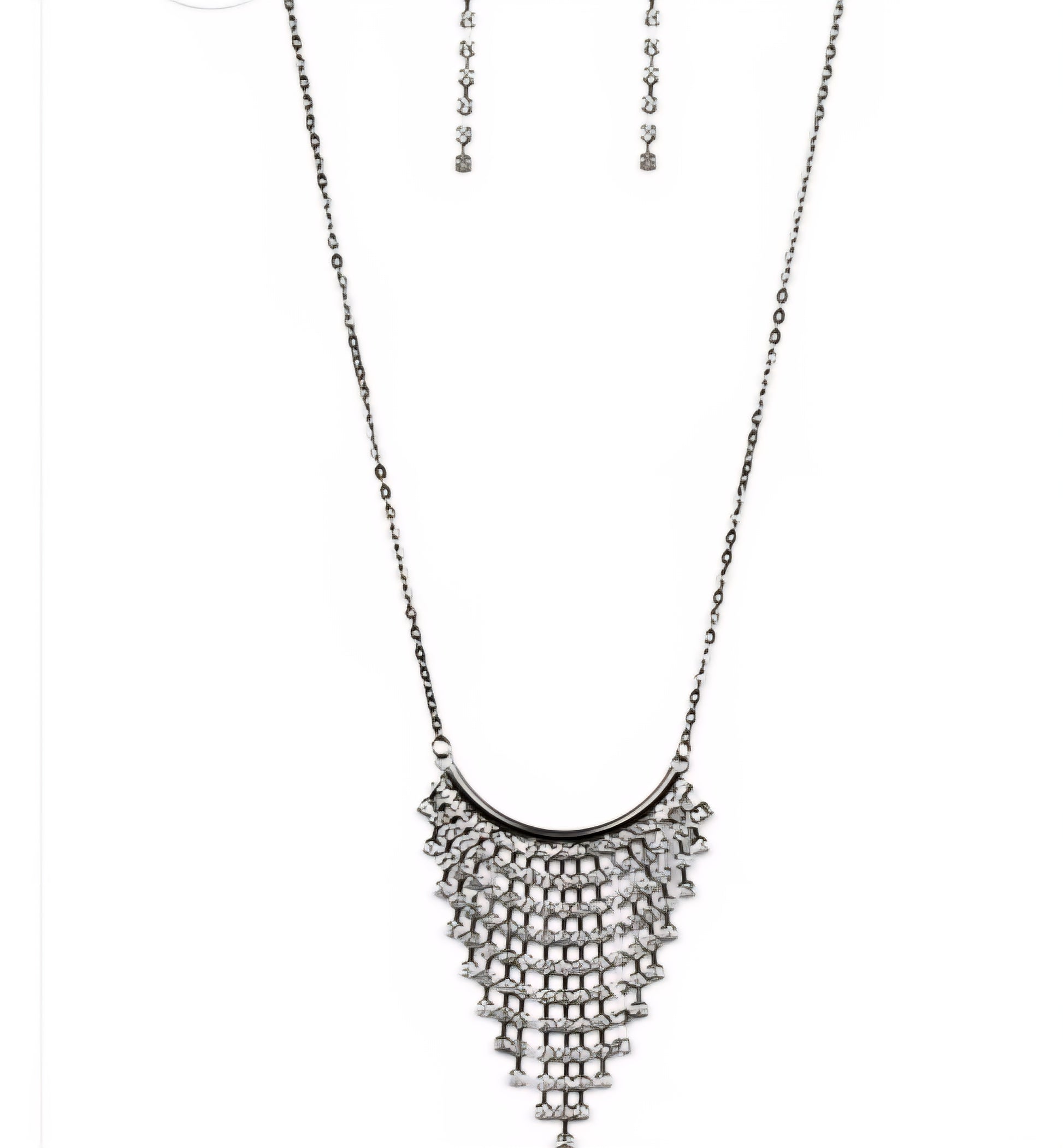 Chains of glittery white rhinestones stream from the bottom of a bowing gunmetal bar, creating a tapered fringe at the bottom of a lengthened gunmetal chain. Features an adjustable clasp closure.
