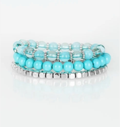 A collection of glassy and polished blue beads, shiny silver cube beads, and ornate silver accents are threaded along stretchy bands around the wrist for a colorfully layered look. Sold as one set of three bracelets.