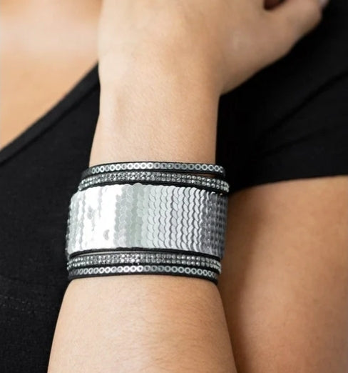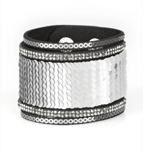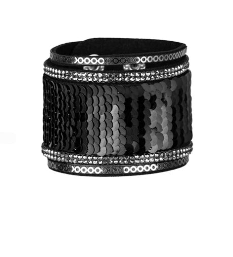 Infused with strands of smoky hematite rhinestones and dainty metallic accents, row after row of shimmery sequins are stitched across the front of a spliced black suede band. Bracelet features reversible sequins that change from silver to silver. Features an adjustable snap closure. Sold as one individual bracelet.