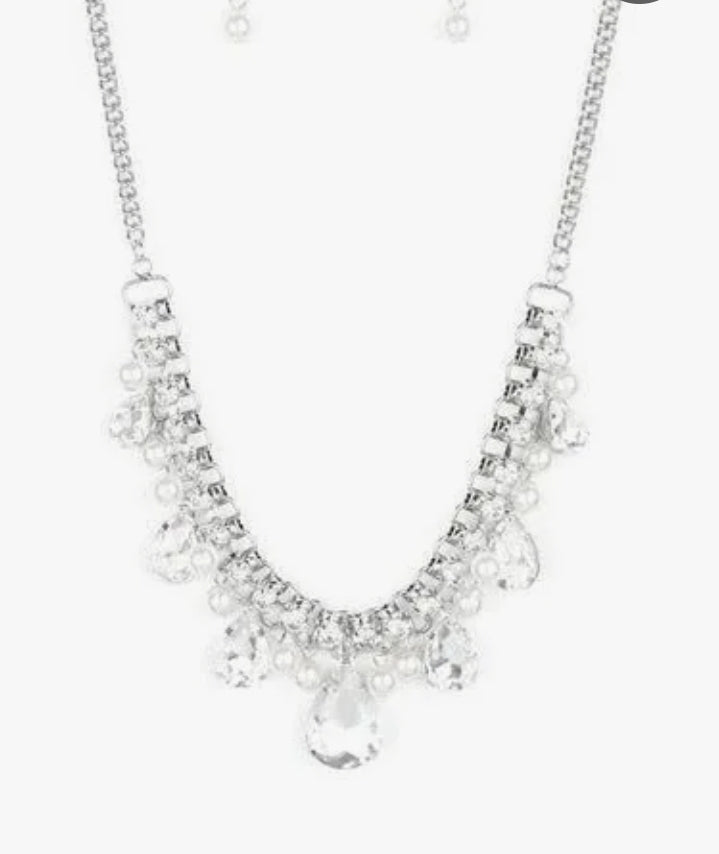 A glamorous collection of bubbly white pearls and exaggerated white teardrop gems dangle from a bold strand of white rhinestones, creating a knockout fringe below the collar. Features an adjustable clasp closure.