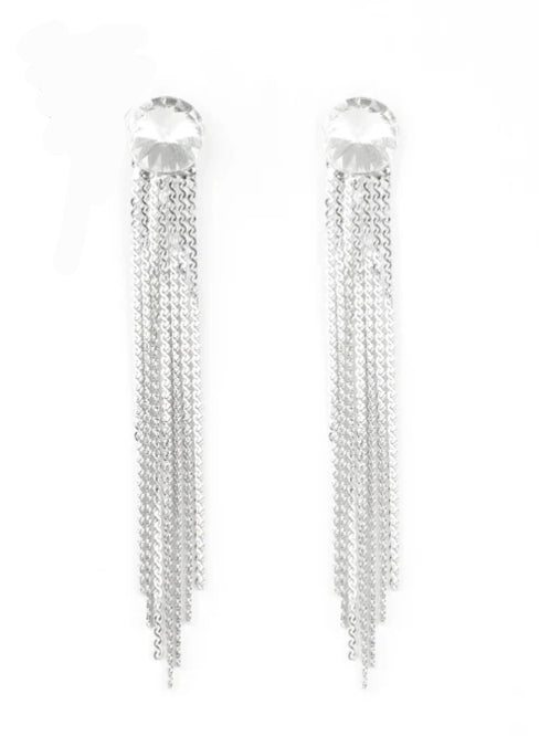 Flat silver chains stream from the bottom of a solitaire white gem, creating a dramatically tapered fringe. Earring attaches to a standard post fitting.