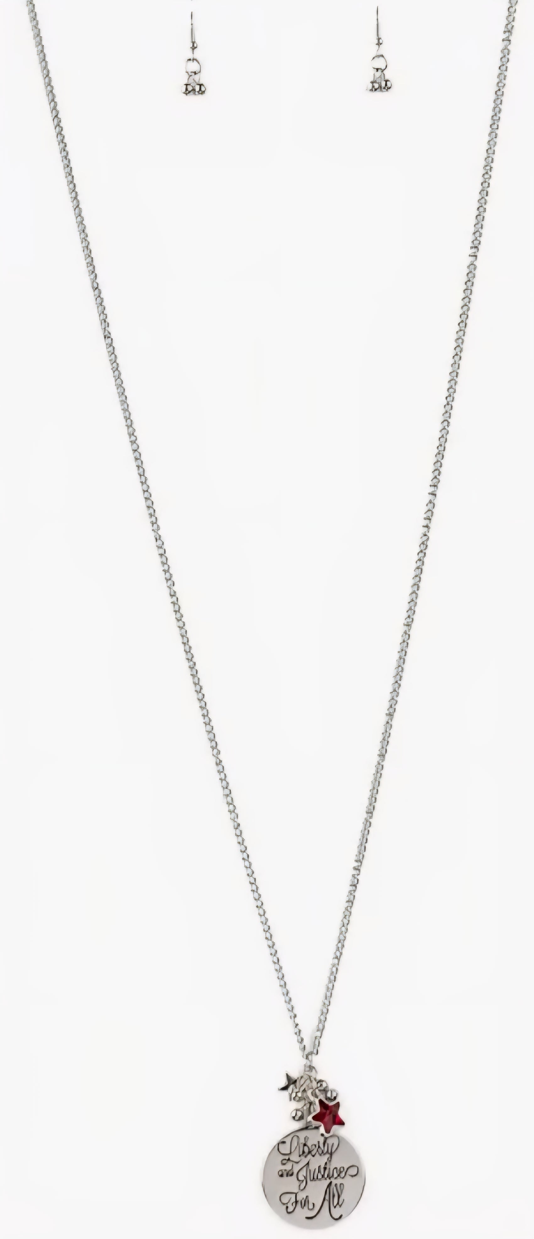 Stamped in the phrase, "Liberty and Justice For All," a silver disc joins a silver star charm and a glittery red rhinestone star pendant at the bottom of a lengthened silver chain for a patriotic inspired look. Features an adjustable clasp closure.