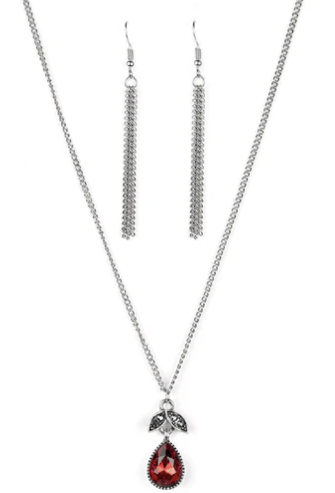 Encrusted in glittery hematite rhinestones, leafy silver frames give way to a red teardrop gem, creating a glamorous pendant below the collar. Features an adjustable clasp closure.