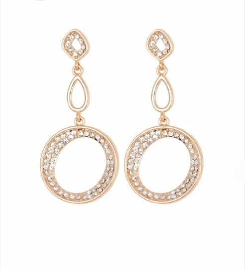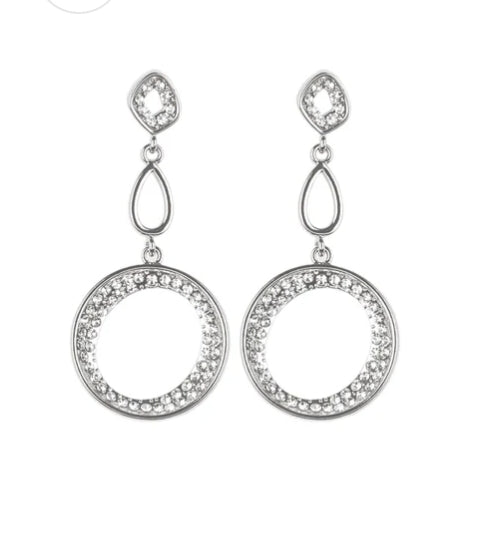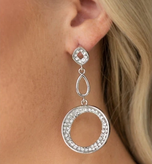 Encrusted in rows of glassy white rhinestones, mismatched beveled silver frames link with a silver teardrop as they trickle from the ear, coalescing into a glamorous lure. Earring attaches to a standard post fitting.