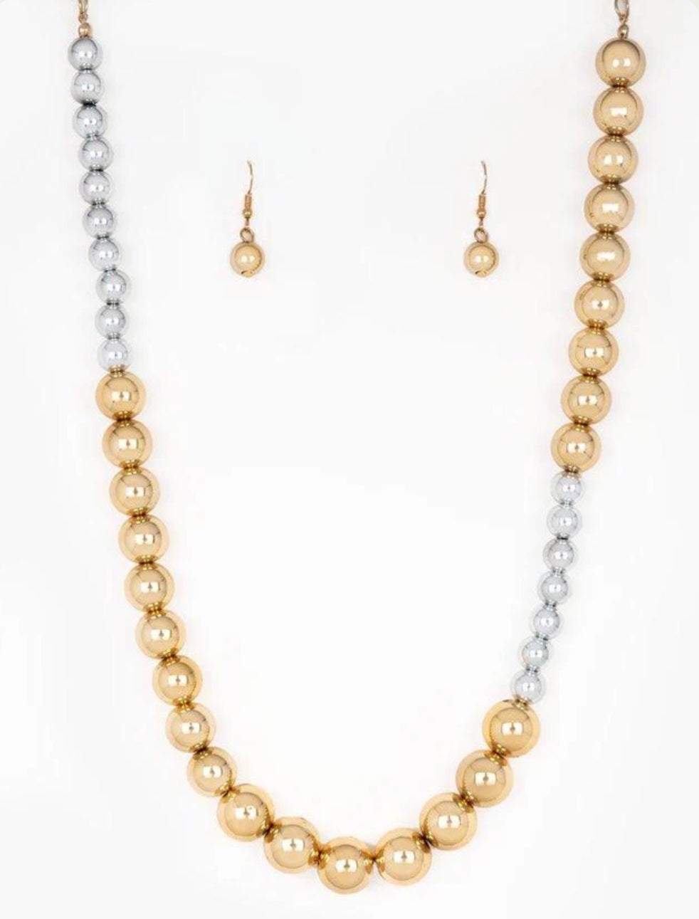 Varying in size, glistening gold and shimmery silver beads drape below the collar in a dramatically asymmetrical fashion. Features an adjustable clasp closure.