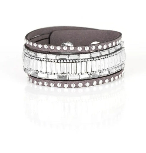 Shiny gold studs, dainty gold ball chains, and edgy black emerald-cut rhinestones race along a spliced black suede band for a rock star look. Features an adjustable snap closure.