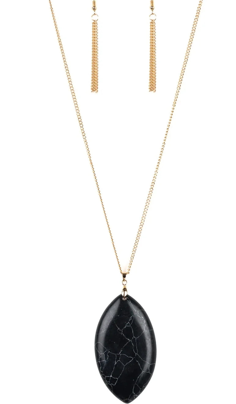Chiseled into a tranquil almond-shape, an oversized black stone pendant swings from the bottom of a lengthened gold chain in a seasonal fashion. Features an adjustable clasp closure.