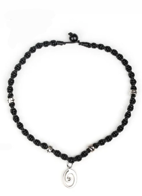Infused with ornate silver beads, a spiraling silver pendant swings from the bottom of a twisted black braided cord for a seasonal flair. Features a button-loop closure.