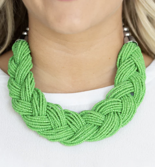 Brushed in a refreshing coral hue, countless seed beads weave into an indigenous braid below the collar. The colorful strands attach to large silver beads, adding a hint of metallic shimmer to the playful design. Features an adjustable clasp closure.