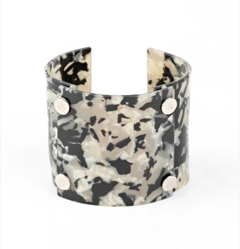 Featuring a shell-like finish, pieces of iridescent acrylic frames are bolted in place into a stylish cuff around the wrist.