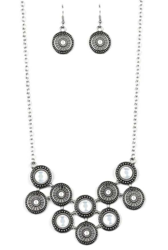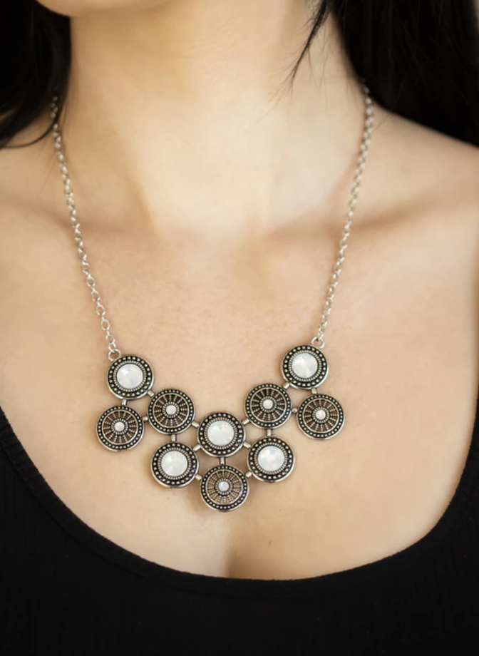 A collection of opalescent white gems dot the centers of studded silver frames that connect into a starry centerpiece below the collar. Features an adjustable clasp closure.